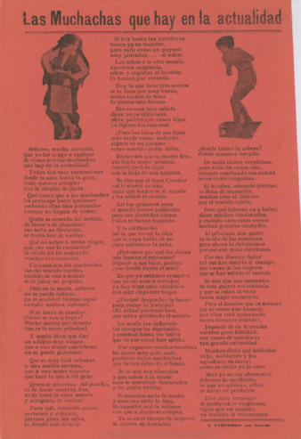 Fragmento de la primera estrofa: "Señores, mucha atención, que yo les vengo a explicar de como son las muchachas que hay en la actualidad.” | 1 hoja color rojo impresa en offset: 30 x 20 cm; Fecha de publicación no identificada