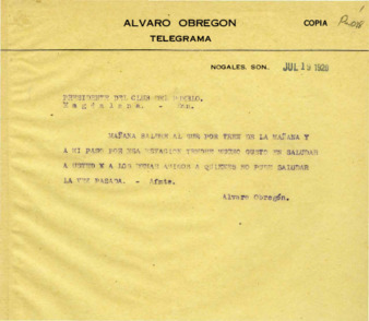 Telegrama del Gral. Alvaro Obregón al Presidente del Club del Pueblo de Magdalena, Son. citándolo para saludarlo. Exp. P-018