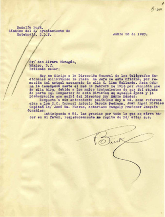 Carta del Sr. Rodolfo Buck al Gral. Alvaro Obregón, informándole que solicitó la plaza de Jefe de Oficina de Telégrafos en Matehuala, S.L.P. Exp. B-010