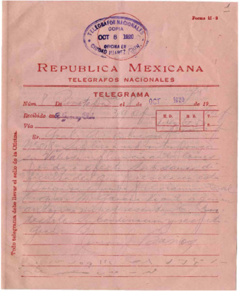 Telegrama del Gral. Juan J. Baños al Gral. Alvaro Obregón, pidiendo una cita para el Gral. García Vigil a fin de que le informe cuál es la situación de su brigada. Respuesta aceptando recibirlo.