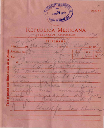 Fondo: Fernando Torreblanca/2. Serie: Secretaría Particular de la Presidencia de la República/2.10 Subserie: Telegramas