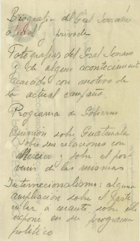 Cuestionario que presenta el General Francisco R. Serrano al Sr. José María de Muñoz, representante del EXCELSIOR DE GUATEMALA. Declaraciones del General Serano y un boletín de prensa que responden al cuestionario, en las que se analizan las relaciones México-Guatemala y se explica cómo funciona el Comité Pro-Serrano. José María de Muñoz lamenta no haber podido ver al General Serrano en Puebla, ya que se cruzaron en el camino; solicita le informe cuánto y en qué forma se le dará una ayuda voluntaria para que su periódico trabaje en la propaganda de su candidatura a la Presidencia.
