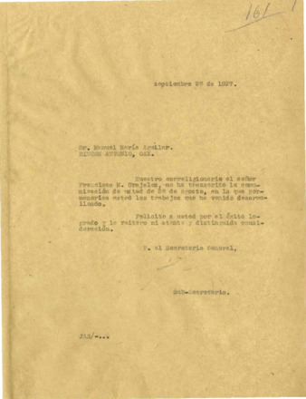 Justo A. Santa Anna, Subsecretario del Comité Pro-Serrano, informa a Manuel María Aguilar haber recibido de Francisco M. Grajales la transcripción de la comunicación hecha por el mismo Aguilar informando de los trabajos desarrollados en Rincón Antonio, Oax.