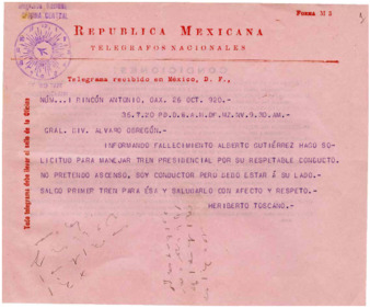 Telegrama del Sr. Heriberto Toscano al Gral. Alvaro Obregón, solicitándole el puesto de conductor del tren presidencial. Respuesta agradeciendo su ofrecimiento e indicando que hay varios candidatos para ese trabajo.