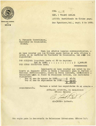Alejandro Lubbert, Cónsul General de México en San Francisco, Cal., E.U.A., certifica los pagos hechos a Fernando Torreblanca en su carácter de Visitador de Consulados.