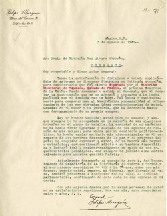 Cartas del Corl. Felipe Murguía, Jefe del Departamento de Caballería de la Secretaría de Guerra y Marina al Gral. Alvaro Obregón, ofreciendo sus servicios y comunicando que sus enemigos políticos le han enviado informes erróneos de su persona. Respuesta indicando que no ha recibido ninguna información. Vecinos del 3er. Distrito Electoral del D.F. informan al Gral. Obregón la situación política de su distrito y las arbitrariedades del Corl. Felipe Murguía. Exp. M-71