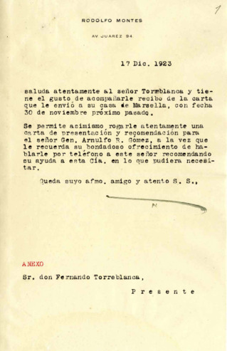 Pascual Ortiz Rubio recomienda con Fernando Torreblanca al Sr. Salvador Aceves y le explica que dicho señor figura en una lista que envió el Presidente de la República para que a los que ahí se mencionan se les coloque en alguna oficina pública.