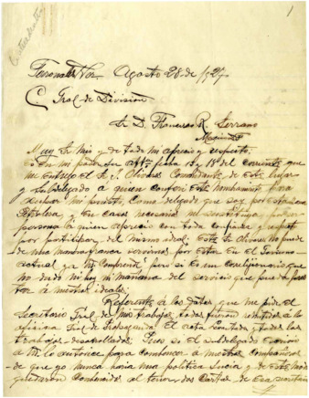 Carta del General Francisco R. Serrano al Licenciado Federico Sodi, pidiéndole que en unión del General Carlos A. Vidal lo representen ante los delegados que nombre el General Arnulfo R. Gómez para discutir las bases de fusión entre ambos candidatos y acordar cuál de los dos seguirá figurando como candidato único antirreeleccionista.