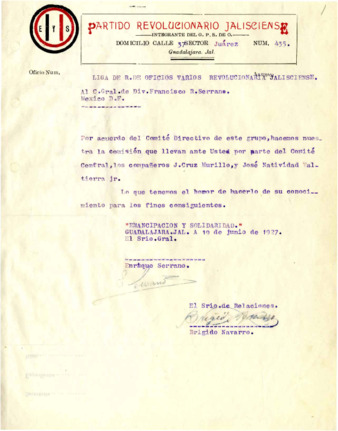 Nota en la que se resume la carta de Justo A. Santa Anna, Subsecretario del Comité Pro-Serrano a Ismael Sol, Presidente del Sindicato de Campesinos de Tuxtla Gutiérrez, Chis., informando que ya quedó establecido el Comité Pro-Serrano, poniéndose a sus órdenes y sugiriendo se pongan en contacto con la Comisión de Organización y Registro de Partidos.