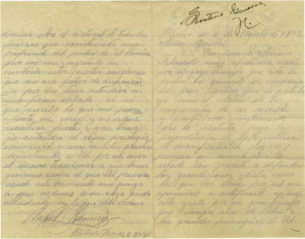 Carta del Sr. Angel Ramírez al Gral Francisco R. Serrano ofreciendo trabajar por su candidatura a la Presidencia y elogiando sus postulados. Respuesta del General Arturo Lazo de la Vega, Secretario General del Comité Pro-Serrano, agradeciendo a nombre del General Serrano las frases de adhesión que le envió.