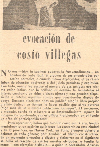 Recorte del periódico Excélsior. Diorama de la Cultura, que incluye un artículo de la autoría de Jaime García Terrés titulado Evocación de Cosío Villegas. Incluye fotografía de Cosío Villegas.