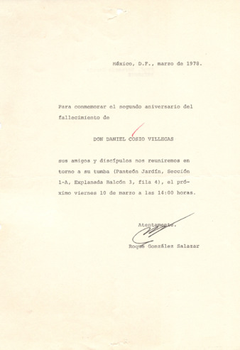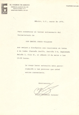 Correspondencia relacionada con el acto de conmemoración del tercer aniversario de la muerte de Daniel Cosío Villegas, en la que Roque González Salazar, Coordinador General Académico de El Colegio de México, invita a asistir a todos los interesados a la tumba de Cosío Villegas para tal efecto. Contiene listado de posibles asistentes, con sus direcciones de localización, así como indicaciones de Roque para que se extienda un cheque que cubra el costo de un arreglo floral. Incluye un borrador, mecanuscrito, de al parecer un discurso pronunciado en dicha conmemoración.