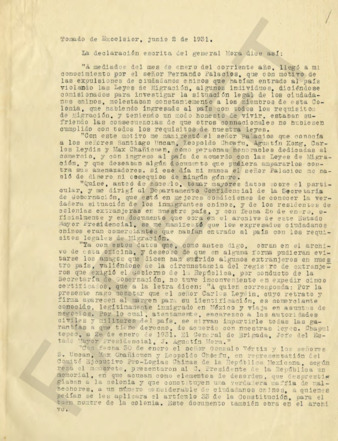 Informe del Gral. Agustín Mora en relación a conflictos surgidos entre la comunidad china.