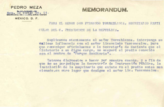 El Sr. Pedro Meza pide a Fernando Torreblanca su ayuda para que el Secretario de Instrucción Pública, Licenciado Vasconcelos, comunique oficialmente a la Secretaría de Hacienda que no ocupará el predio conocido como "Parque Sanitario".