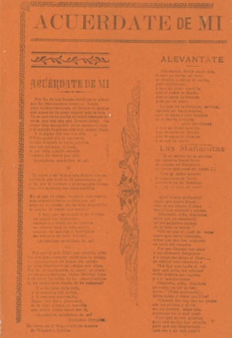 Fragmento de la primera estrofa: "Junto al viejo muro que al jardín rodeaba un blanco rosal, sembró allí mi amada” | 1 hoja color anaranjado impresa en offset: 30 x 20 cm; Fecha de publicación no identificada