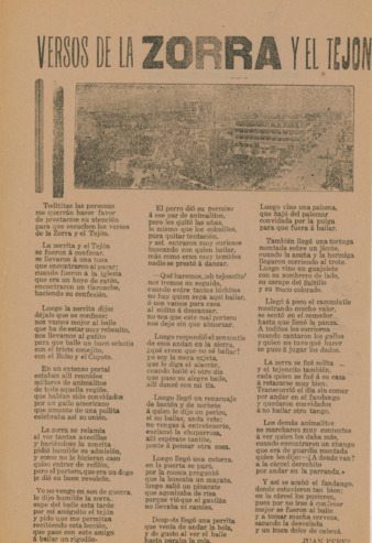 Fragmento de la primera estrofa: "Todititas las personas me querrán hacer favor de prestarme su atención para que escuchen los versos de la Zorra y el Tejón.” | 1 hoja color amarilla impresa en offset: 30 x 20 cm; Fecha de publicación no identificada