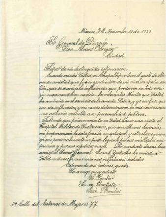 Carta del dentista, Dr. José Benitez al Gral. Alvaro Obregón, saludándolo y esperando verle cuando visite el Hospital Militar de Instrucción.