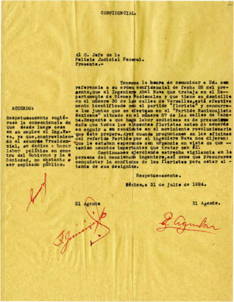 Carta de los Agentes del Ministerio Público, T. Jiménez y P. Aguilar al Jefe de la Policía Judicial Federal, informando que el Ing. Abel Nava, que trabaja en el Departamento de Bienes Nacionales, pertenece al Partido Florista, asiste a las juntas que se efectúan en el Partido Nacionalista Mexicano y hace labor política en contra del Gobierno.
