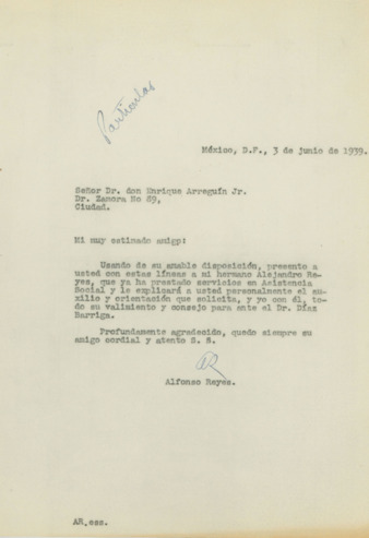 Correspondencia relacionada con la ayuda presentada por La Casa de España en México Justo Somonte. Contiene: Carta de Alfonso Reyes, dirigida a José Mancisidor, director general de Enseñanza Secundaria de la Secretaría de Educación Pública, en la que solicita información sobre la solicitud de revalidación de estudios de Rafael Somonte Altamira. Incluye carta de Alfonso Reyes en la que certifica que los estudios presentados por Rafael Somonte cursados en el Instituto de Bayona, cubren el cuadro de estudios de secundaria en México. Carta de Reyes, dirigida a Enrique Arreguín, en la que presenta a Justo Somonte, farmacéutico que puede ser de utilidad para la Secretaría de Asistencia Pública. Carta de Alfonso Reyes, dirigida a José Puche, presidente del Comité Técnico de Ayuda a los Españoles, en la que presenta al farmacéutico Somonte, quien podría ser de utilidad para la fabricación de productos farmacéuticos, incluso como miembro del Consejo de Administración de los laboratorios. Carta de Antonio Giral, dirigida a Alfonso Reyes, en la que agradece la información recibida por José Puche, sobre la utilidad de Somonte.