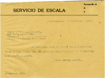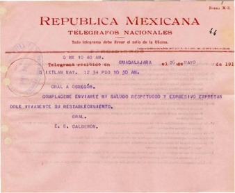 Telegrama del Gral. Alvaro Obregón al Gral. Esteban Baca Calderón expresándole sus condolencias por la muerte de su padre.