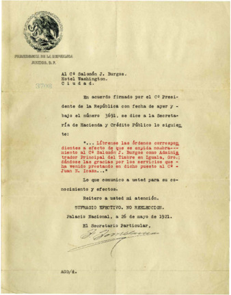 El Sr. Fernando Torreblanca comunica al Sr. Salomón J. Burgos su nombramiento como Administrador Principal del Timbre en Iguala, Gro.