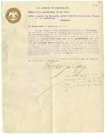Fondo: Álvaro Obregón/3. Sección: Primera campaña política/3.5 Serie: Correspondencia 1920 (expedientes integrados)