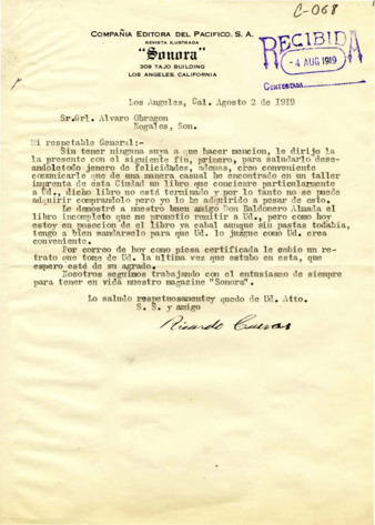 Carta del Sr. Ricardo Cuevas al Gral. Alvaro Obregón, informando estar mandándole un libro que en su contra se va a publicar en Los Angeles, Cal., E.U.A.