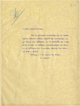 Certificado de que el Dr. Enrique Uribe prestó sus servicios como médico del Ejército. Recomendación del Gral. Alvaro Obregón, a quien corresponda, a favor del Dr. Enrique Uribe. Exp. U-3