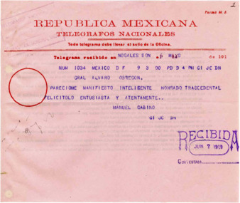 Telegrama del Sr. Manuel Gabino al Gral. Alvaro Obregón felicitándolo por su MANIFIESTO A LA NACION.