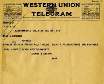 Correspondencia entre el Dr. Andrés Castro, el Sr. Ignacio Gaxiola y el Gral. Alvaro Obregón conteniendo felicitaciones y asunto relativo al préstamo que el Gral. Obregón hace al Dr. Andrés Castro de dinero en efectivo para pagar su regresoa México.