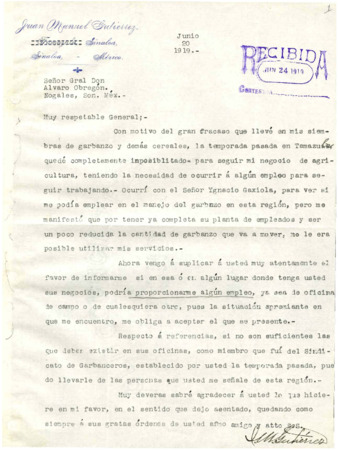 Fondo: Álvaro Obregón/3. Sección: Primera campaña política/3.1 Serie: Correspondencia 1919, segunda mitad (sub-serie original)