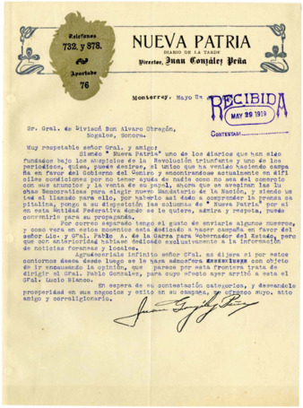 Correspondencia entre el Sr. Juan González Peña, Director del periódico NUEVA PATRIA de Monterrey, N.L. y el Gral. Alvaro Obregón, en la que el primero comunica al Gral. Obregón la disponibilidad de su periódico para apoyar su candidatura. Respuesta enviándole el MANIFIESTO A LA NACION a fin de que sea publicado. El Sr. Juan González Peña comunica al Gral. Obregón que ha sido publicado su Manifiesto y le solicita ayuda para seguir publicando el periódico. Respuesta agradeciendo e informando lo ayudará a conseguir fondos. El Gral. Alvaro Obregón le envía copia de la contestación a la carta del Gral. Pablo González, así como la declaración que hace a la prensa, a fin de que sean publicadas.