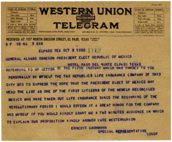 Telegrama del Sr. Ernesto Grohmann al Gral. Alvaro Obregón solicitándole una entrevista. Respuesta indicando fecha y lugar.