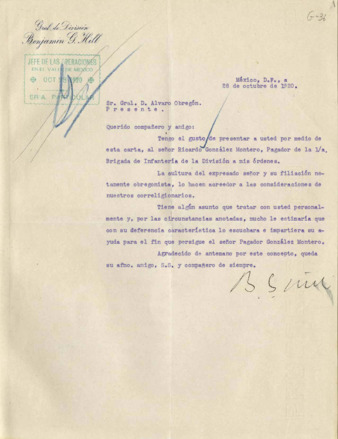 Carta del Gral. Benjamín Hill, Jefe de Operaciones Militares en el Valle de México al Gral. Alvaro Obregón, recomendando al Sr. Ricardo González Montero. Exp. G-36