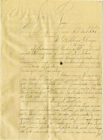 Carta del Sr. Ysidoro Huerta al Gral. Alvaro Obregón solicitándole fondos para viaje.