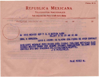Telegrama del Sr. J.H. Perestrejo al Gral. Alvaro Obregón, transcribiendo un mensaje del Sr. Luis G. Iberri felicitándolo por su triunfo electoral.