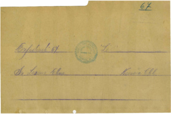 Portada con el sello del Comité Pro-Serrano titulada "Expediente #67 "L". Sr. Lozano Eliseo. Nonoava, Chih.". Cartas de Eliseo Lozano al General Francisco R. Serrano, ofreciendo trabajar por conseguirle votos en el estado de Chihuahua. Respuestas de Justo A. Santa Anna agradeciendo y pidiendo le dé informes más amplios sobre su radio de acción.