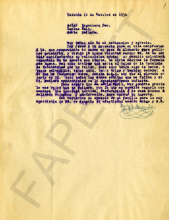 Carta de Carlos Melo Santander a Driedrich Seedorf invitándolo a que visite la Granja Avícola Santa Bárbara para proporcionarle mayores detalles sobre las incubadoras y criadoras eléctricas.