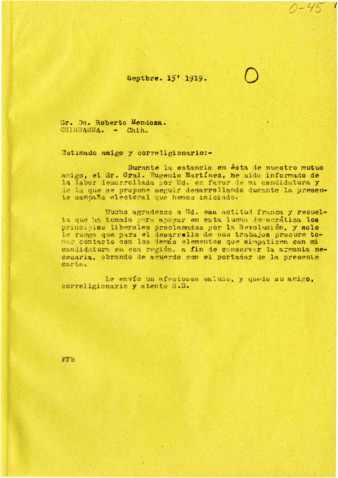 Fondo: Álvaro Obregón/3. Sección: Primera campaña política/3.1 Serie: Correspondencia 1919, segunda mitad (sub-serie original)