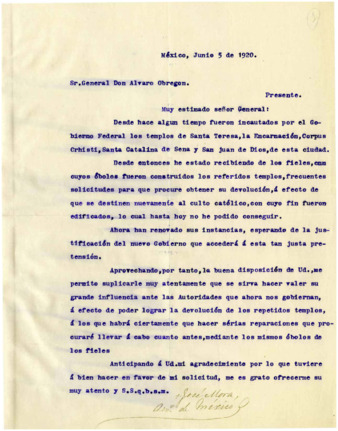 Carta del Sr. José Mora, Arzobispo de México, al Gral. Alvaro Obregón, solicitándole sean devueltos los templos católicos que fueron tomados por el gobierno federal.