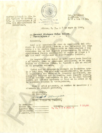 Cartas que envía el profesor Carlos B. Munguía, director del Centro Escolar "Estado de Sonora", al general PEC invitándolo para que asista a una función que se celebrará en el Teatro Ideal con el fin de recabar fondos para la adquisición de mobiliario para dicho plantel, le adjunta boletos y el programa del referido acto; contestándole el general PEC que compra cuatro boletos y que le envía el importe de los mismos.