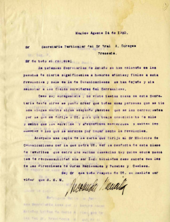Fondo: Álvaro Obregón/4. Sección: Presidencia de la República Mexicana/4.1 Serie: Correspondencia (expedientes integrados)