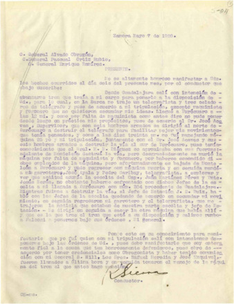 Carta al Gral. Alvaro Obregón, al Gral. Pascual Ortiz Rubio y al Gral. Enrique Ramírez del conductor R. Sierra, sobre los problemas a los que se enfrentó en el tren de Guadalajara a Zamora por defender la causa obregonista. Exp. S-011