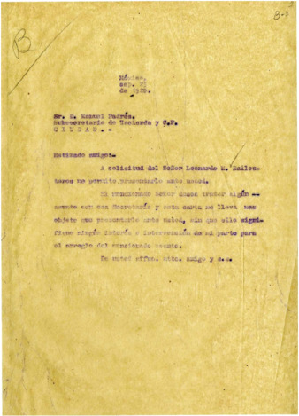 Carta al Sr. Manuel Padrés, Subsecretario de Hacienda y Crédito Público del Gral. Alvaro Obregón, presentando al Sr. Leonardo M. Ballesteros. Exp. B-3