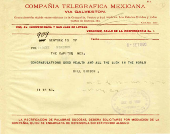 Telegrama del Sr. Bill Gibson al Gral. Alvaro Obregón felicitándolo por su triunfo electoral. El mismo mensaje se lo transcribe el Sr. J.H. Perestrejo.