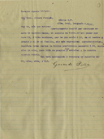Carta del Sr. Gerardo Piña al Gral. Alvaro Obregón agradeciéndole el dinero que le envió con el Sr. Quintín Rosas.