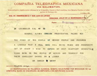 Telegrama del Dr. Summer J. Quint, de Los Angeles, Cal., E.U.A. al Gral. Alvaro Obregón, felicitándolo por su triunfo electoral. El Sr. J.H. Perestrejo transcribe el mismo mensaje al Gral. Obregón.