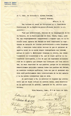 Carta de los Srs. Pablo R. Ramos, Severiano Morales, Felis Pérez, Gorgorio Alvarado y otros miembros de la Congregación de Riva Palacio, de la municipalidad de Gral. Bravo, Coah. al Gral. Alvaro Obregón, solicitándole evite la remoción de los empleados no-honorarios en la Comisión Local Agraria del Estado, a fin de que terminen el trámite de la dotación de tierras para su Congregación.