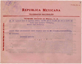 Telegrama del Corl. Rosendo Robles al Gral. Alvaro Obregón, indicando que se encuentra en la ciudad de México.