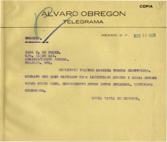 Telegrama del Sr. Aurelio Ortega a la Sra. María Tapia de Obregón solicitando le informe de la salud del Gral. Obregón. Respuesta indicando se ha restablecido.